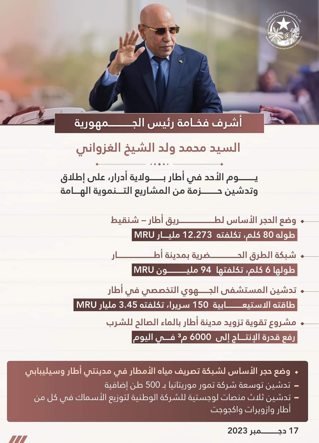 أشرف فخامة رئيس الجمهورية السيد محمد ولد الشيخ الغزواني، يوم أمس الأحد في أطار بولاية أدرار، على إطلاق وتدشين حزمة من المشاريع التنموية الهامة. من بين هذه المشاريع طريق اطار شنقيط وتوسعة مصنع التمور في اطار وشبكة الطرق الحضرية بالمدينة ومشروع تقوي...