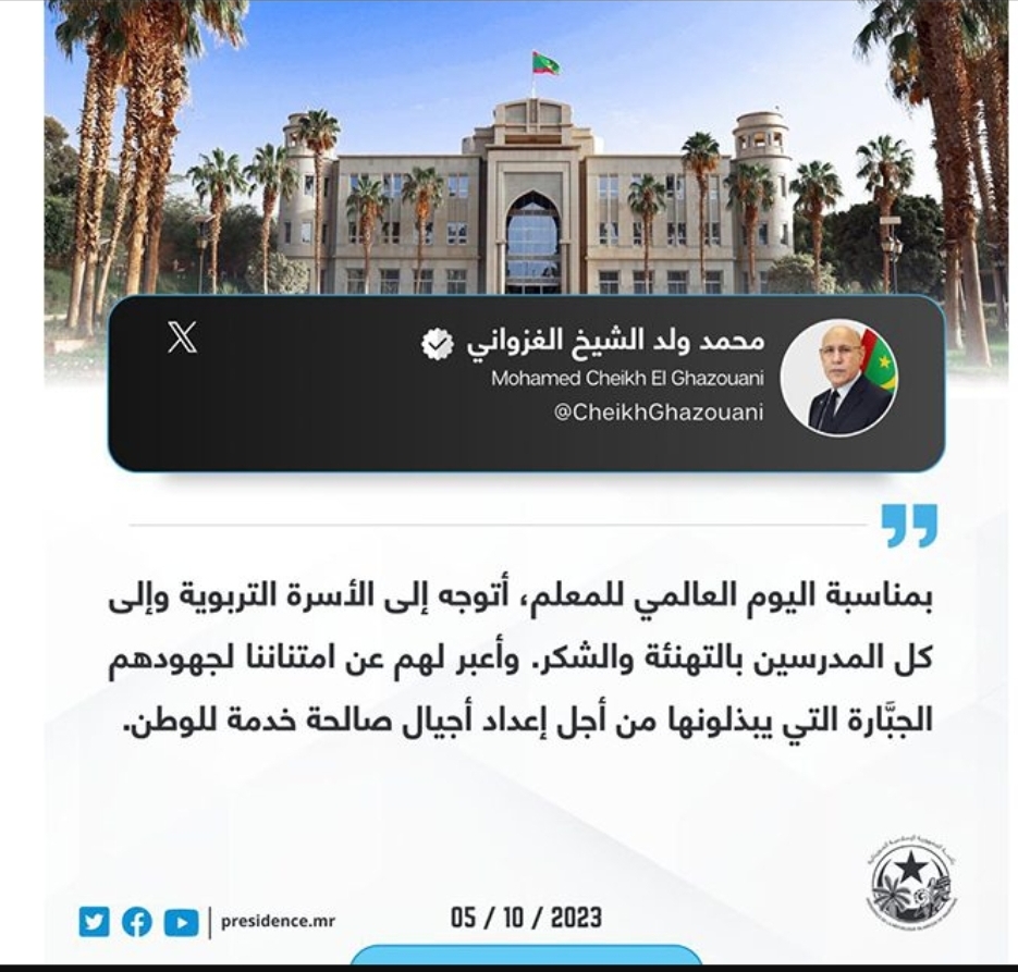 هنأ فخامة رئيس الجمهورية السيد محمد ولد الشيخ الغزواني، المدرسين، شاكرا لهم جهودهم الجبارة، جاء ذلك في تغريدة له مساء اليوم الخميس على حسابه في منصة “إكس”، بمناسبة يوم المعلم، وهذا نص التغريدة: