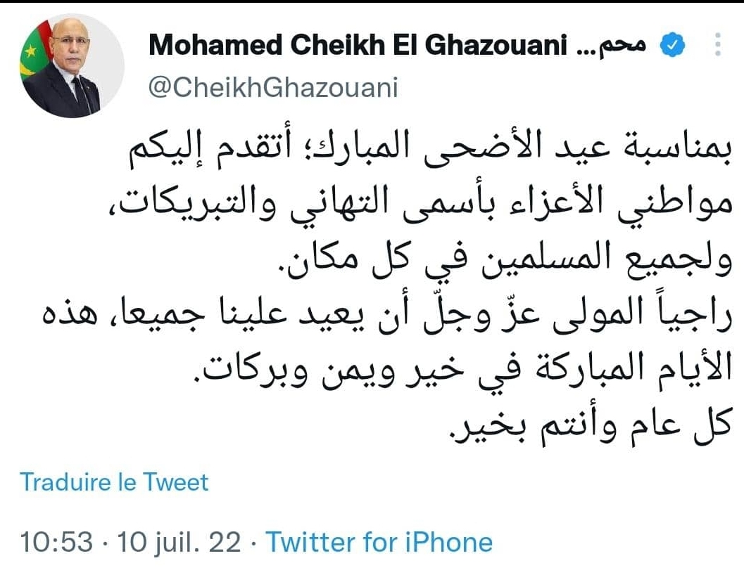 هنأ فخامة رئيس الجمهورية محمد ولد الشيخ الغزواني الشعب الموريتاتي وجميع المسلمين بمناسبة عيد الأضحى المبارك..