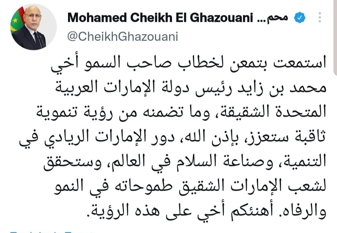 أوضح فخامة رئيس الجمهورية، السيد محمد ولد الشيخ الغزواني، أن الرؤية التنموية الثاقبة لرئيس دولة الإمارات العربية المتحدة، صاحب السمو الشيخ محمد بن زايد آل نهيان، ستعزز دور دولة الإمارات الريادي في التنمية.