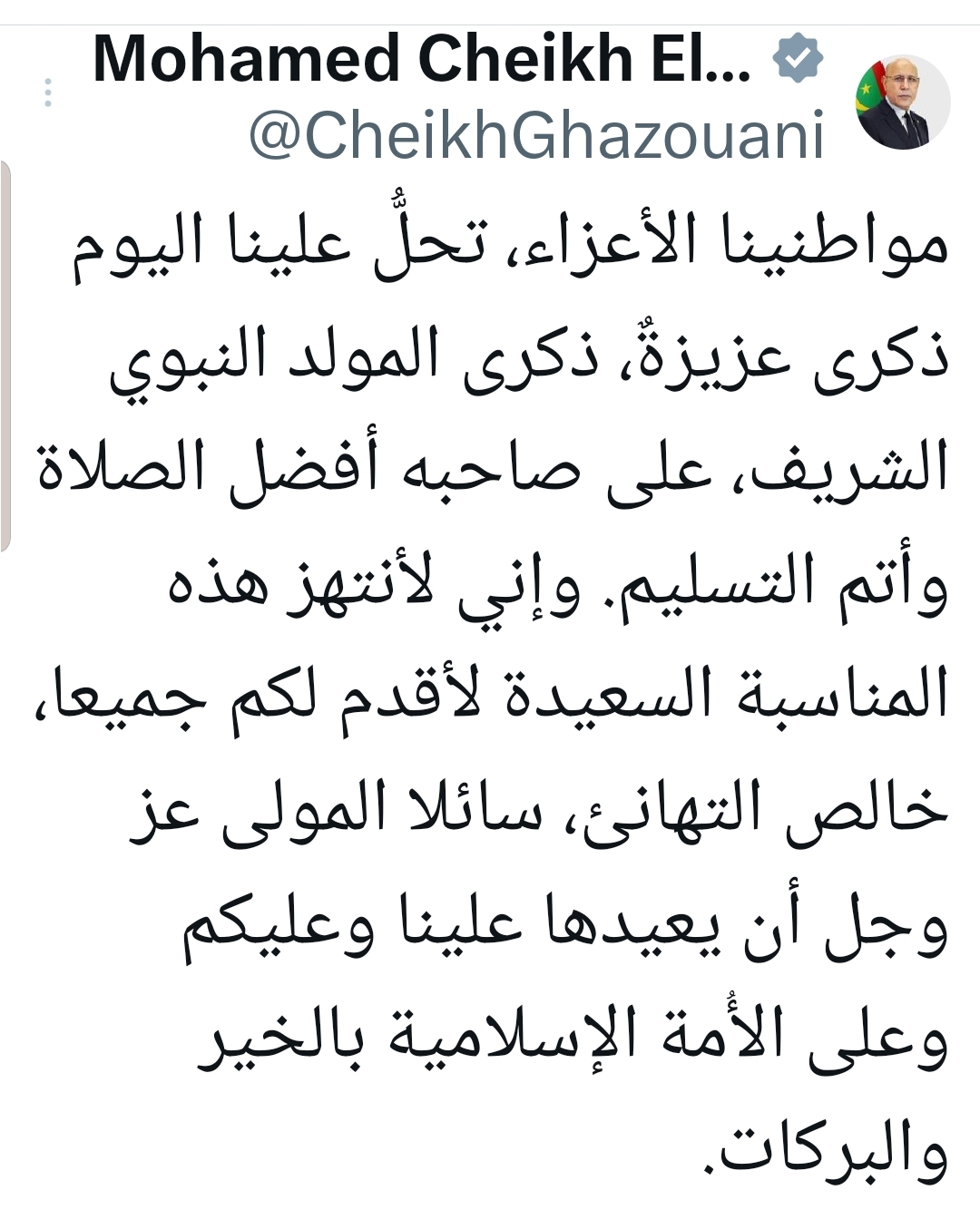 هنأ فخامة رئيس الجمهورية السيد محمد ولد الشيخ الغزواني المواطنين الموريتانيين بمناسبة ذكرى المولد النبوي الشريف.