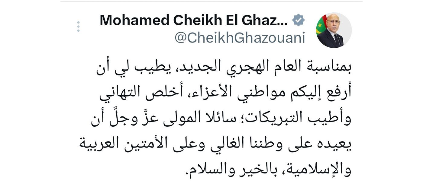 هنأ فخامة رئيس الجمهورية، الرئيس المنتخب السيد محمد ولد الشيخ الغزواني، في تغريدة له على منصة (X)،