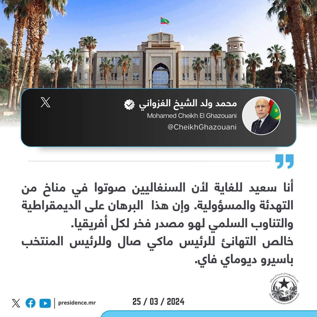أجرى فخامة رئيس الجمهورية السيد محمد ولد الشيخ الغزواني، مساء أمس، اتصالا هاتفيا بأخيه الرئيس السينغالي المنتخب السيد باسيرو ديوماي فاي. وخلال الاتصال جدد فخامة رئيس الجمهورية التهنئة للرئيس المنتخب على الثقة الكبيرة التي منحه إياها الشعب السينغال...