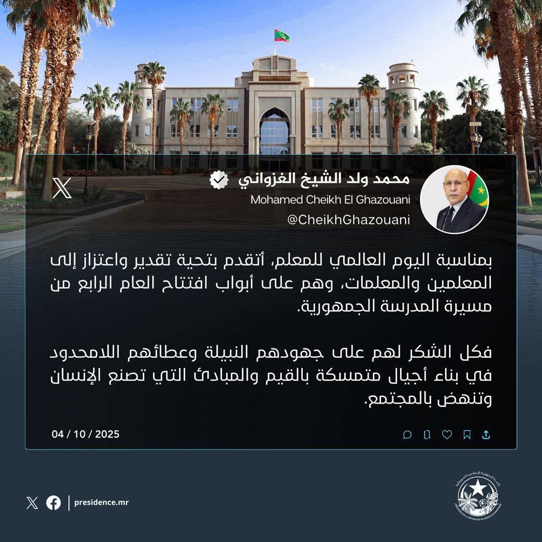 هنأ فخامة رئيس الجمهورية السيد محمد ولد الشيخ الغزواني، عبر حسابه على منصة X المعلمين بمناسبة اليوم العالمي للمعلم؛ شاكرا لهم "جهودهم النبيلة وعطاءهم اللامحدود".