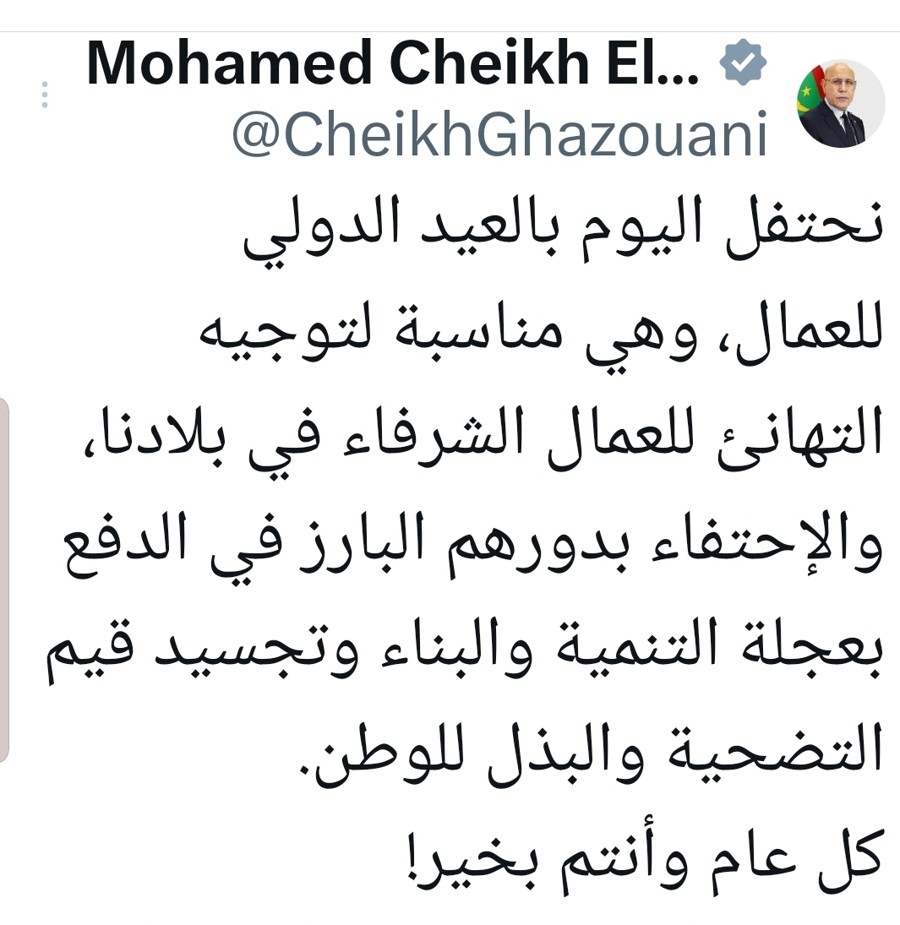 هنأ فخامة رئيس الجمهورية السيد محمد ولد الشيخ الغزواني من حسابه على تويتر العمال بمناسبة العيد الدولي للشغل الذي يصادف فاتح مايو من كل عام. وهذا نص التغريدة: "نحتفل اليوم بالعيد الدولي للعمال، وهي مناسبة لتوجيه التهانئ للعمال الشرفاء في بلادنا، و...