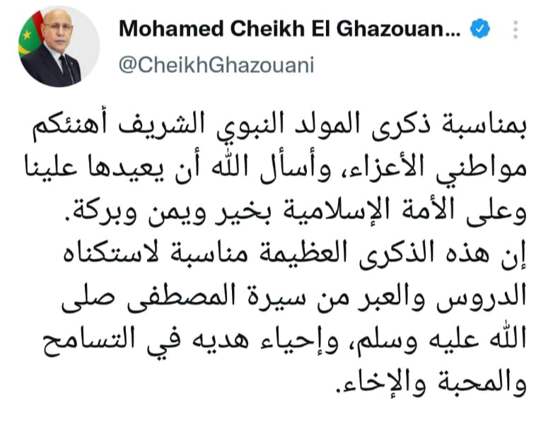 هنأ فخامة رئيس الجمهورية السيد محمد ولد الشيخ الغزواني المواطنين بمناسبة ذكرى المولد النبوي الشريف.
